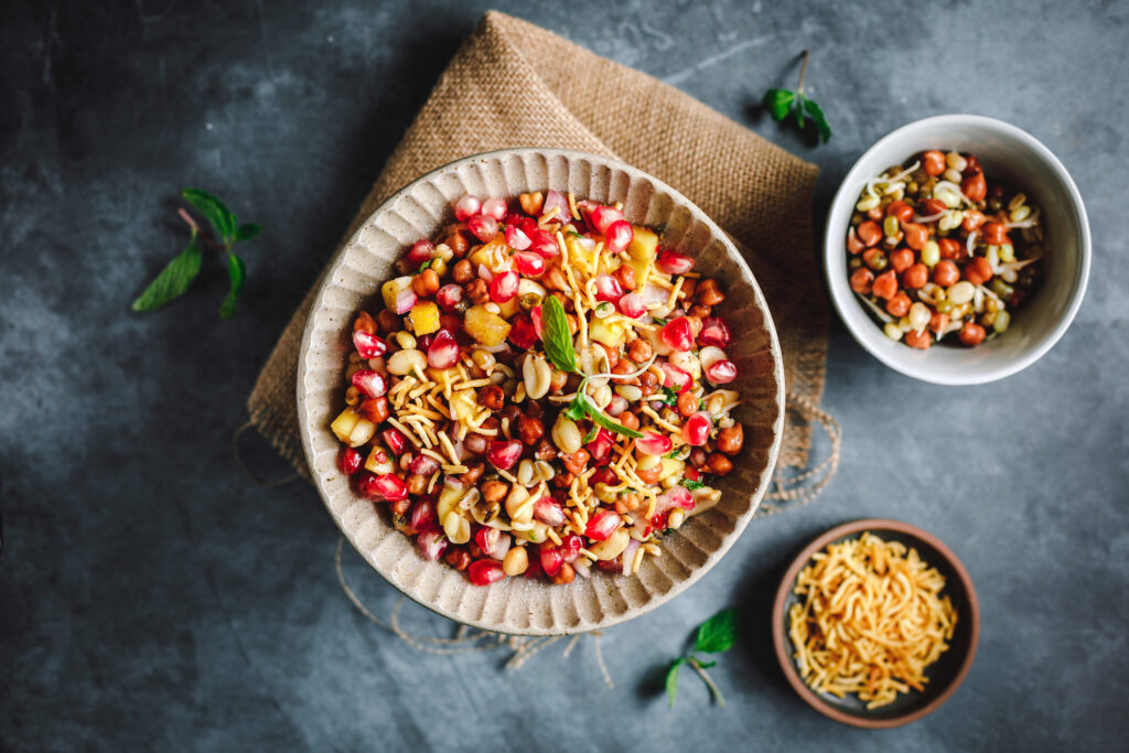 Fruits, vegetables, bread, curd, paneer, boiled corn, sprouts and peanuts are commonly used.